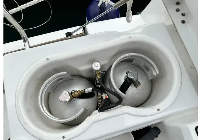 - UPHOLSTERY/COLOUR SCHEME: Faux leather saloon cushions and grey covered foam mattress in cabins