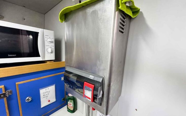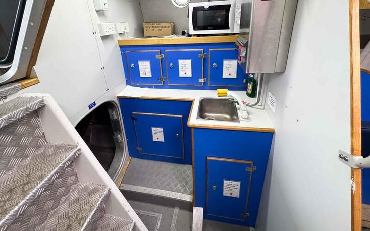 Galley: Compact kitchenette with sink, hob, microwave, jet boiler and storage.