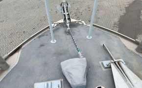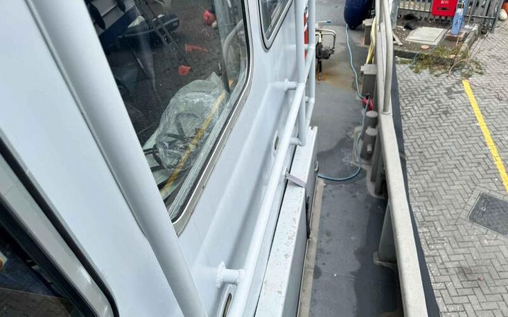 Aluminium guard rails, mooring bitts, and fairleads.