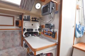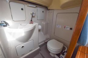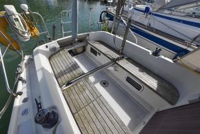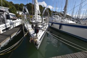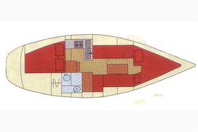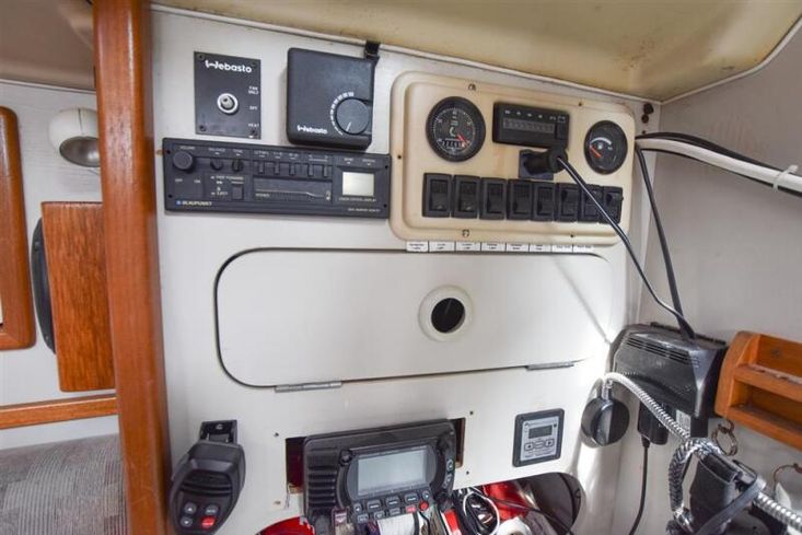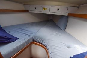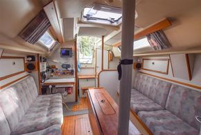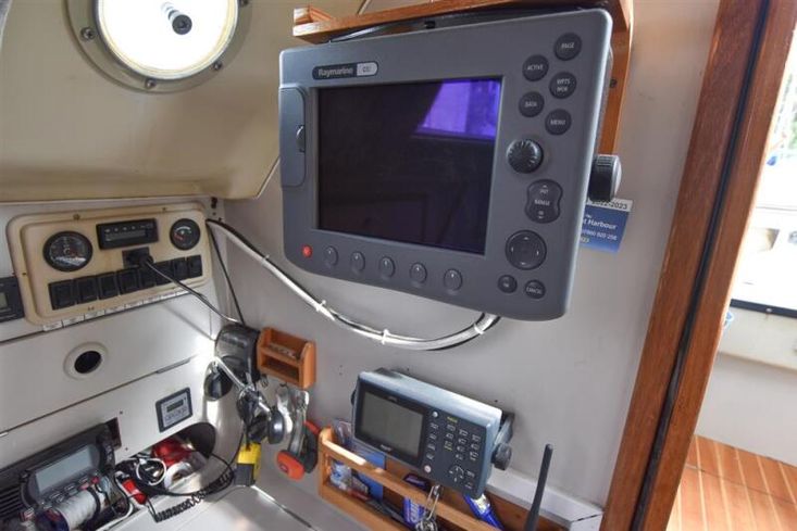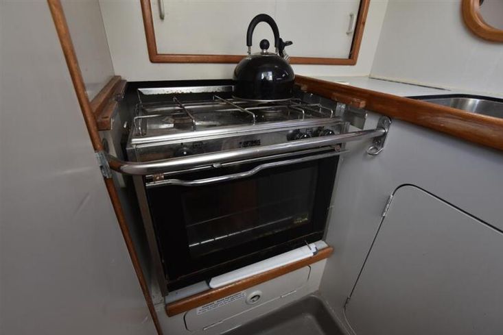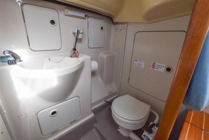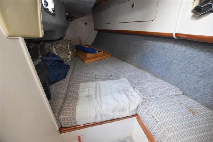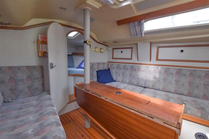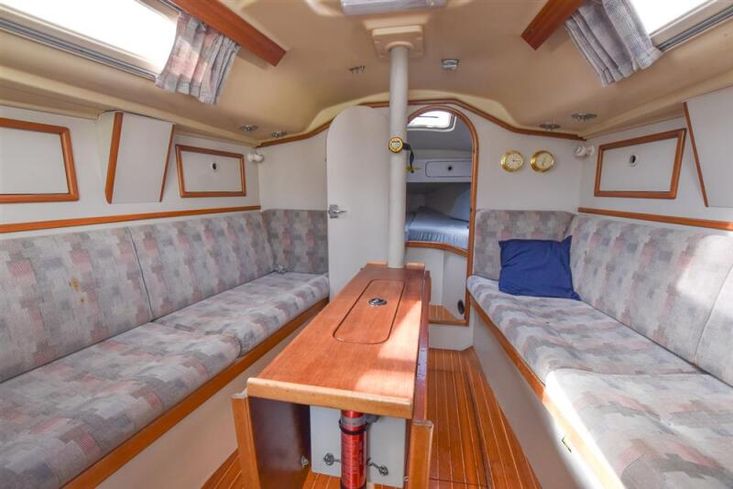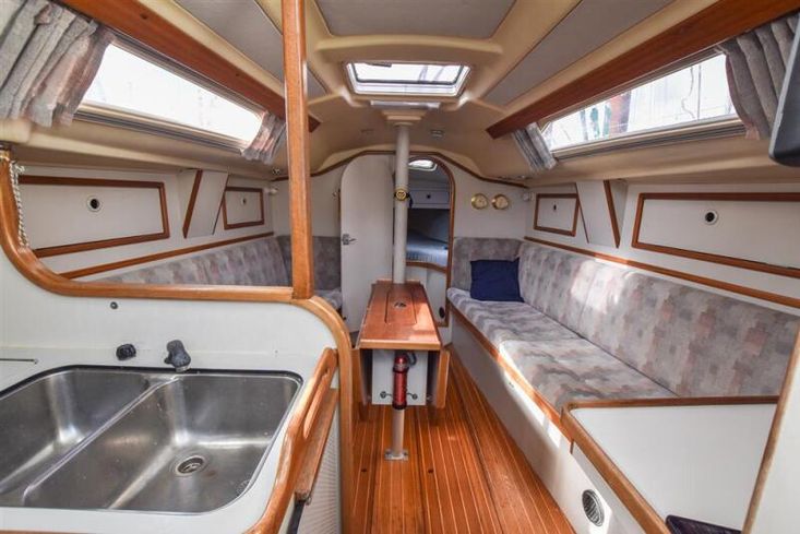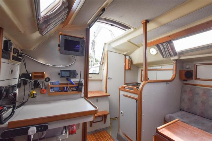 The layout offers up to six berths with two double sleeping cabins separate from the main accommodation. In the fore cabin, V berth with stowage under. Opening hatch to foredeck. Moving aft into saloon, there are two settee berths either side of a fixed saloon table with drop leaves. Aft-facing chart table to starboard with navigation equipment and electrical distribution panel. The L-shaped galley is opposite to port. Two burner gimballed gas cooker with oven & grill. Twin stainless steel sinks with pressurised cold water supply. 50 litre fresh water capacity. Refrigerator. Separate heads compartment to starboard with marine toilet and wash basin. Aft cabin with double berth and hanging locker. Grey patterned upholstery. Curtains. Stereo/CD player.