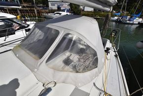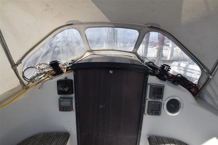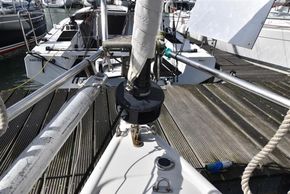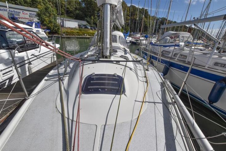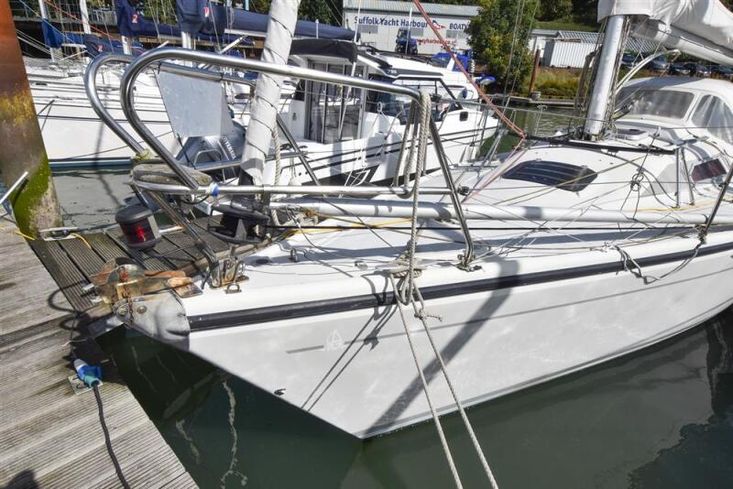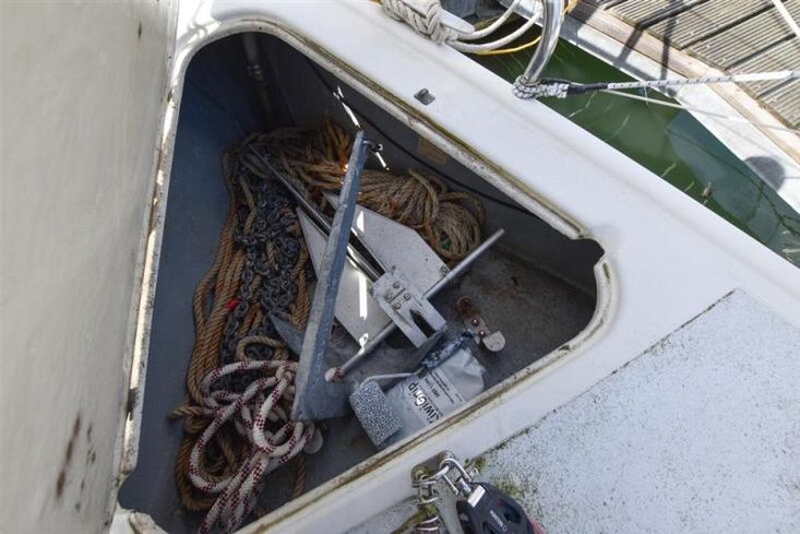 Fractionally rigged Bermudan sloop. Deck stepped alloy mast and boom. Stainless steel standing rigging (2021). Backstay adjuster. Terylene and Dyneema running rigging, replaced as necessary in 2021. Headsail furling system. Slab reefing mainsail with stackpack & lazyjacks. Lines led aft to cockpit. Alloy spinnaker pole. Two Lewmar 30 self-tailing sheet winches. Two Lewmar 16 self-tailing halyard winches.