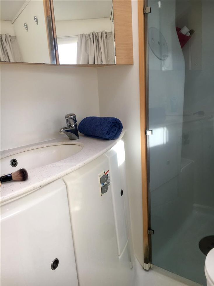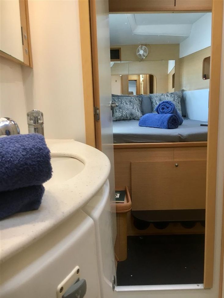 Starboard hull Owner's suite: Centreline double berth, dressing area with sofa and desk, plentiful storage cupboards and wardrobes, large ensuite bathroom forward with separate shower cubicle.