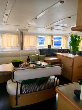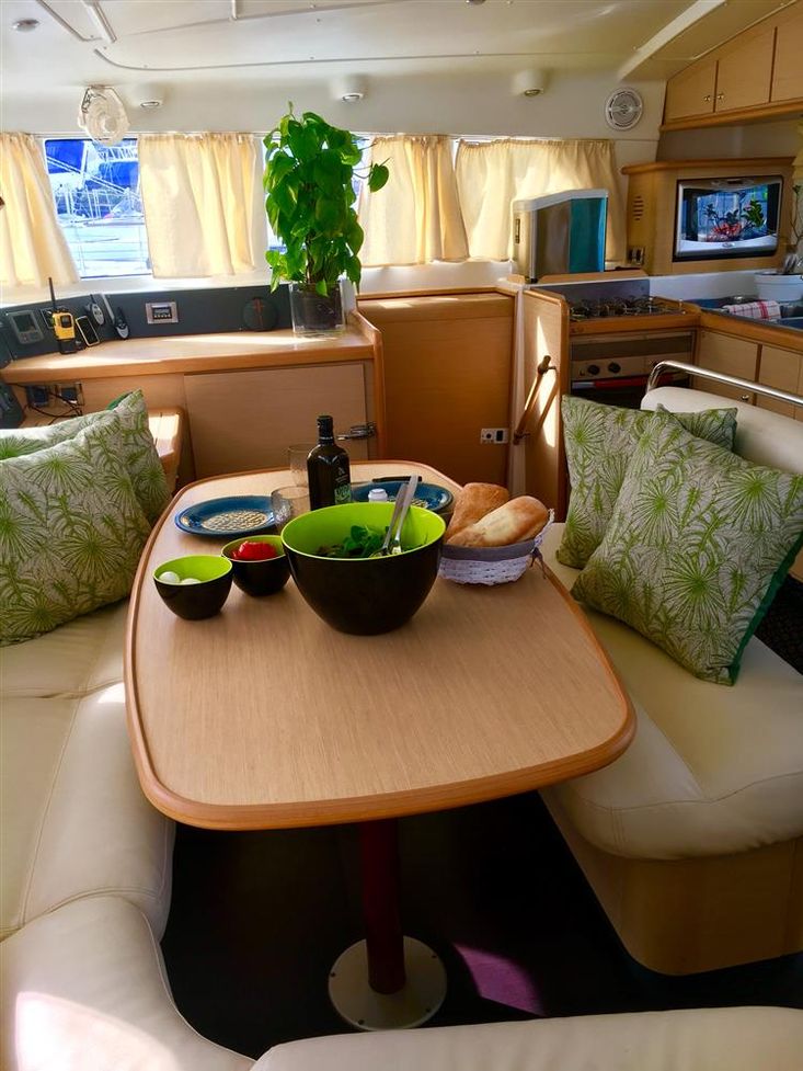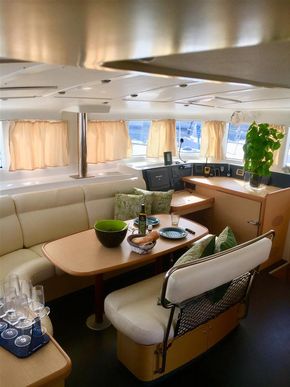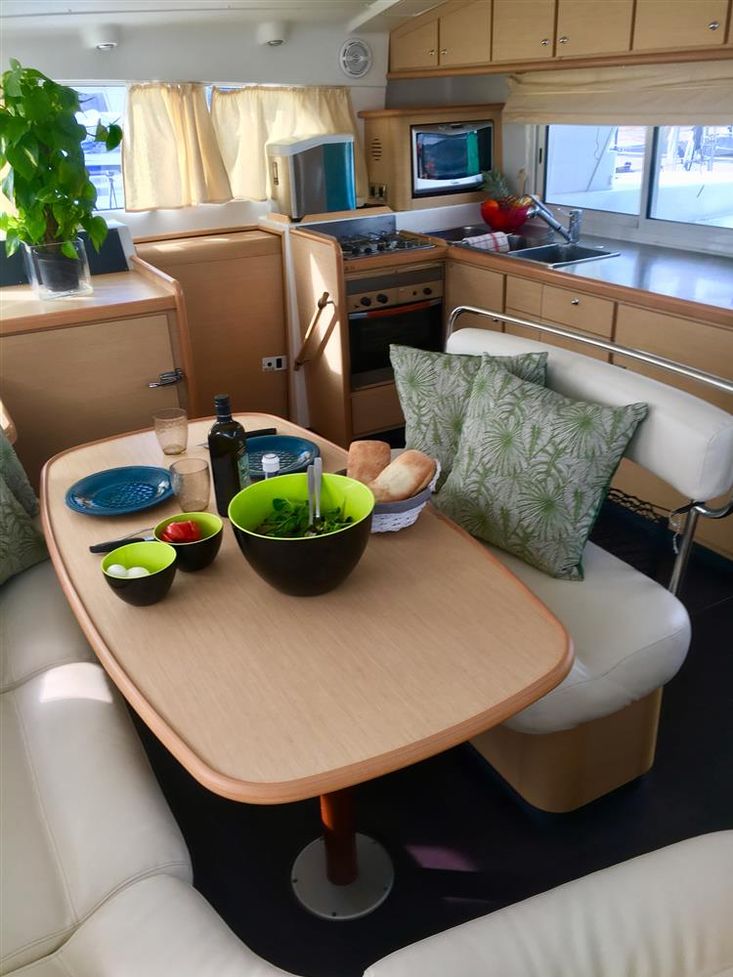 Main deck: A large saloon area provides space for relaxing and dining, featuring a comfortable sofa seating and dining area, and a navigation station with chart table. The galley on this Lagoon 440 is well equipped with a double sink with hot and cold water, stove/oven, microwave, 2x refrigerators and a freezer.