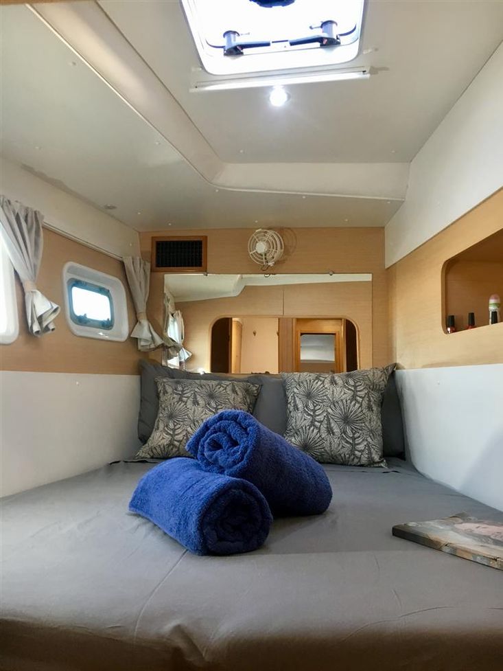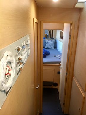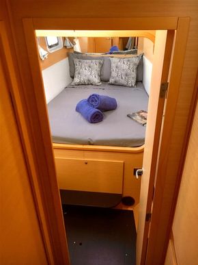 Port hull: Aft double guest cabin with ensuite bathroom and forward double guest cabin with ensuite bathroom.