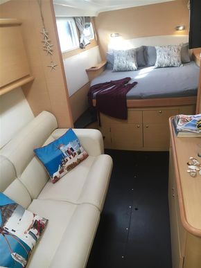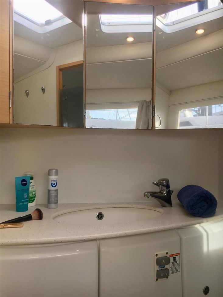 Below deck, the owners’ layout offers a luxurious master suite occupying the entire starboard hull, complete with a spacious double berth, dedicated seating area, generous storage, and a large ensuite with separate shower. The port hull provides two comfortable guest cabins, each with private heads. Her bright, airy saloon and panoramic windows create a wonderful sense of space and light, while the galley-up configuration ensures easy entertaining and social sailing.