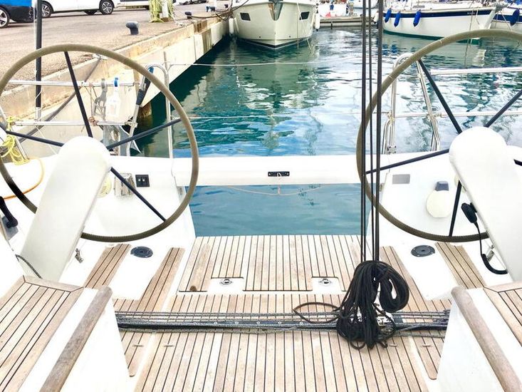 Below deck, she delivers three double cabins, a bright saloon, a practical L-shaped galley and the benefit of Webasto heating for year-round comfort. Navigation, power systems and deck gear are all thoughtfully updated, with lithium batteries, Raymarine Axiom electronics, upgraded anchors and a full cockpit tent/Bimini setup for extended cruising.