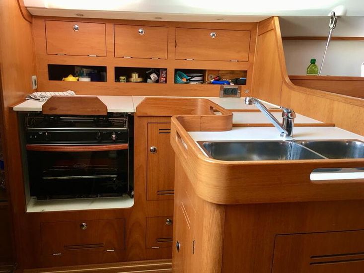 L-shaped galley to port